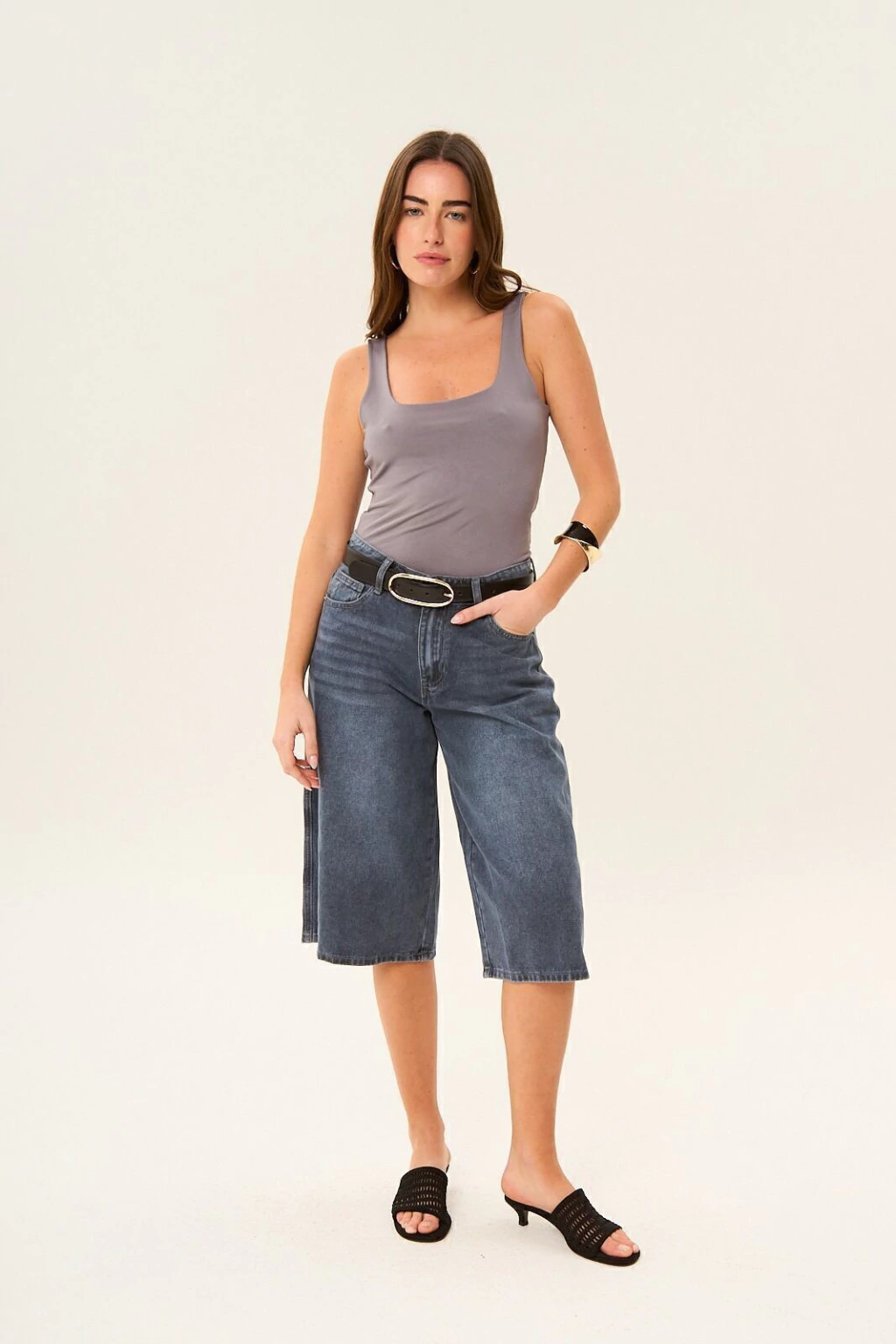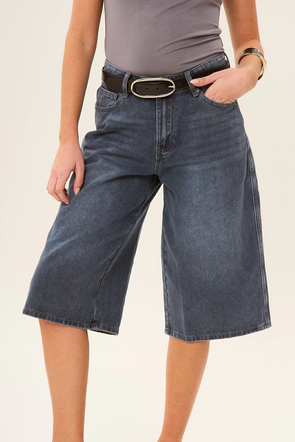Bermuda de tiro alto cinco bolsillos, Cierre frontal con cremallera y botón metálico. Largo debajo de la rodilla. El color es gris medio azulado, con un gastado localizado. Composición: 80% Algodón - 20% Poliéster. La modelo está usando talle 26.