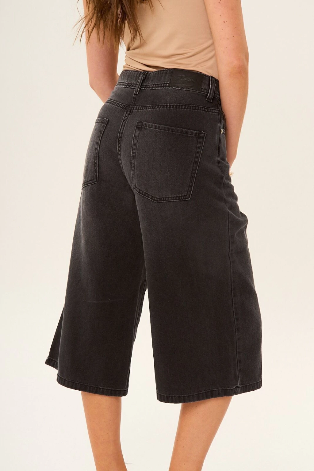 Bermuda larga de tiro alto con cinco bolsillos. Cierre frontal con cremallera y botón. Lavado negro levemente suave. Composición: 100% Algodón. La modelo está usando talle 26.