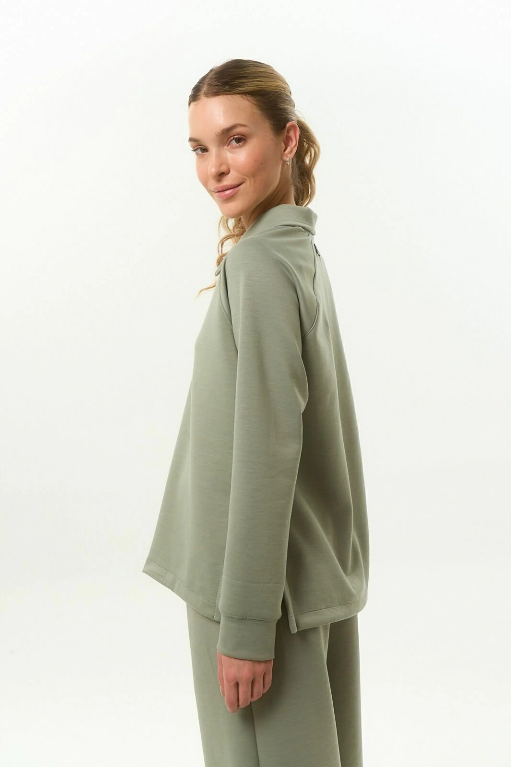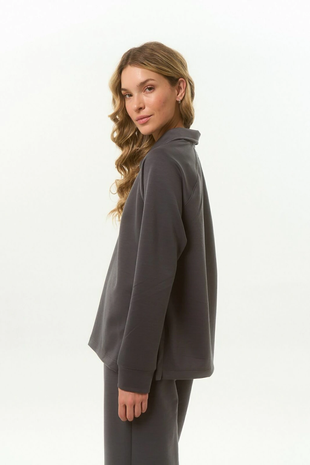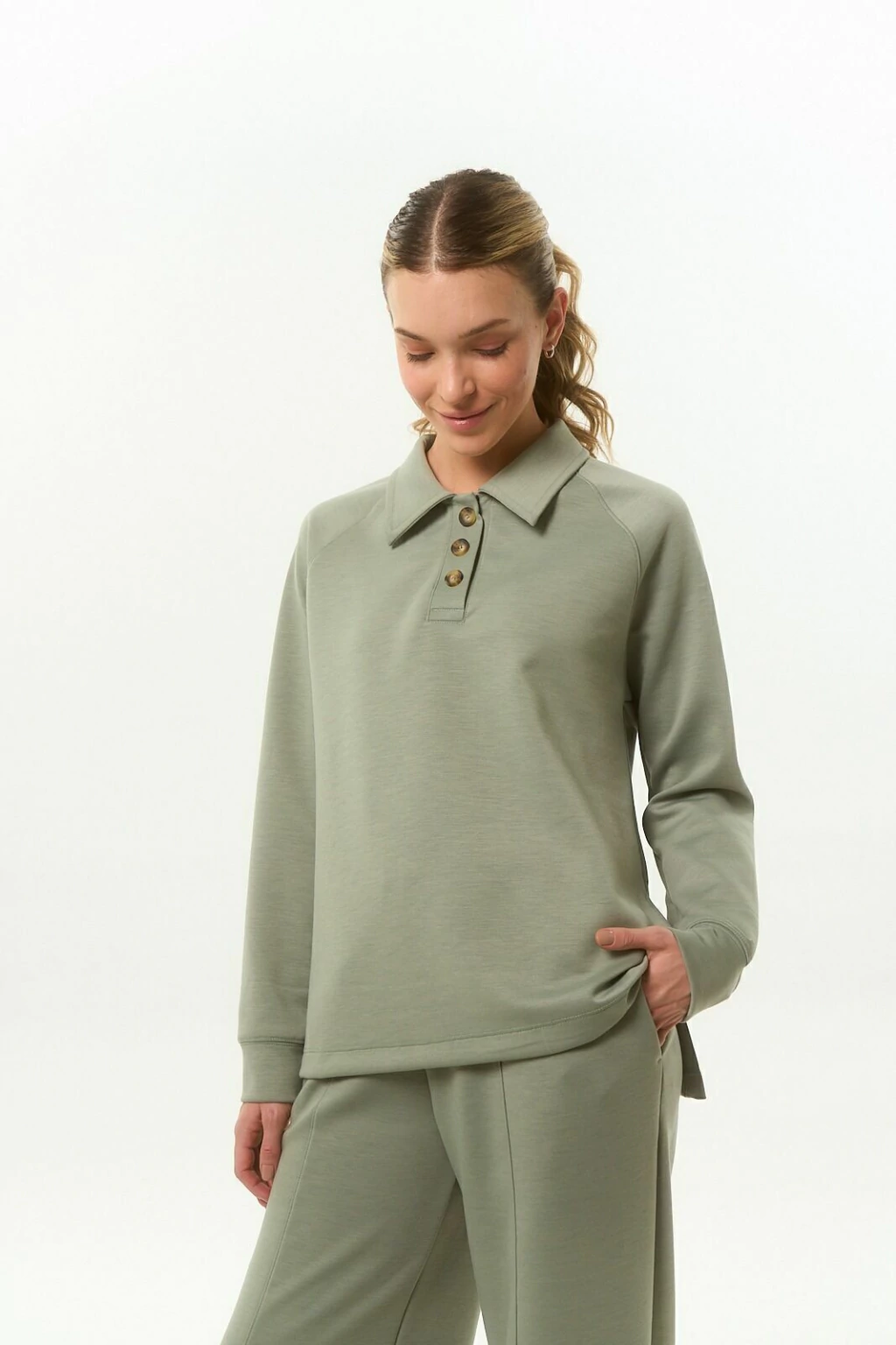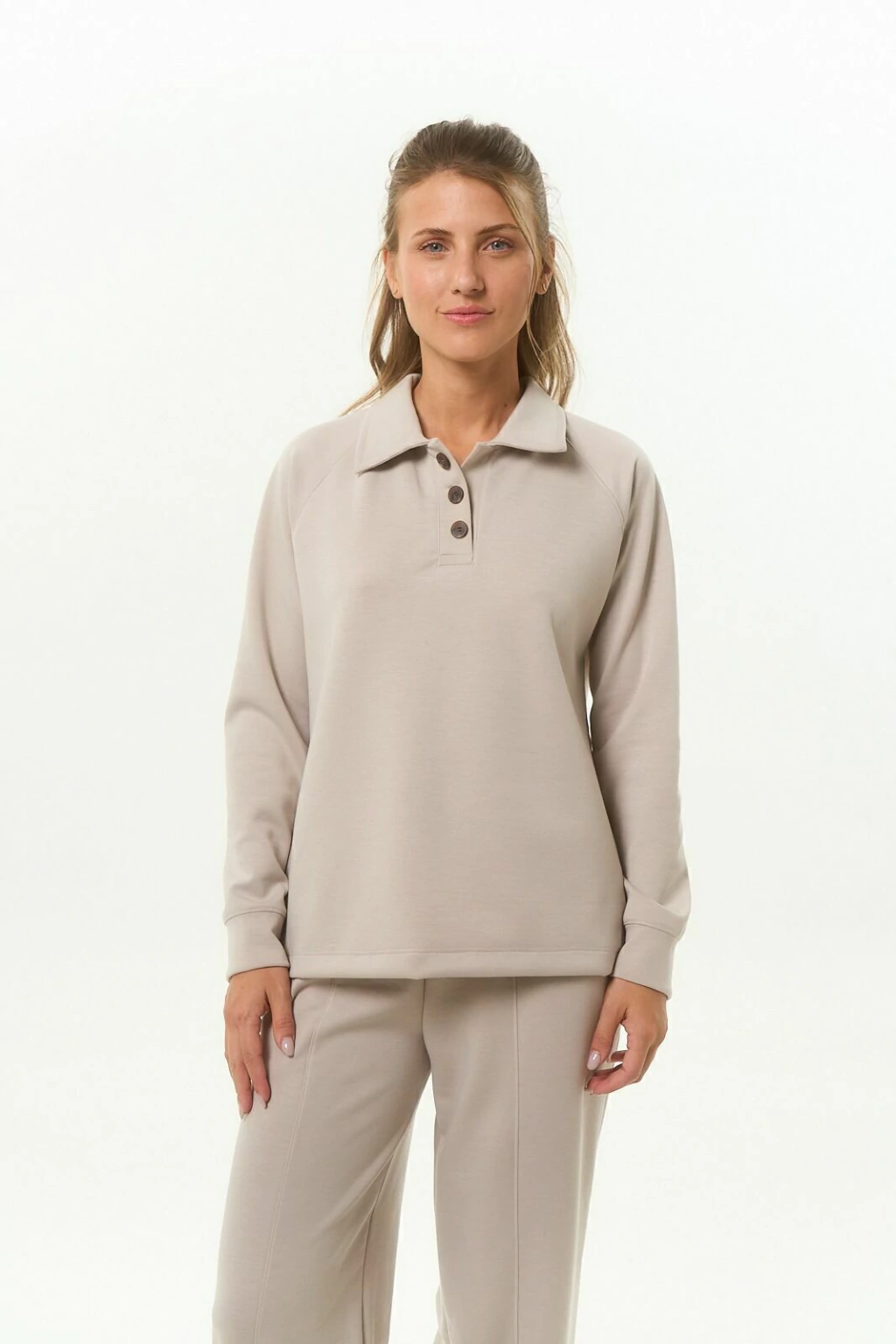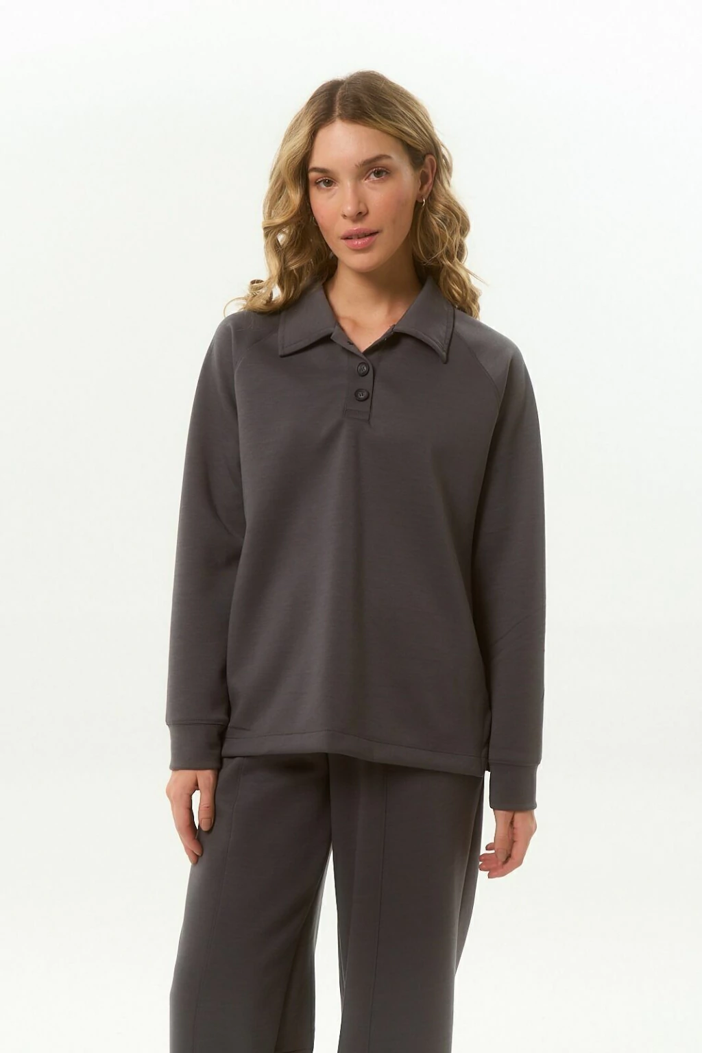 Buzo oversize con cuello camisero, cartera de botónes y mangas largas de corte raglán con puño. ruedo recto con tajos laterales. Combinalo con el Jogging Donna. 96% poliéster - 4% Elastano