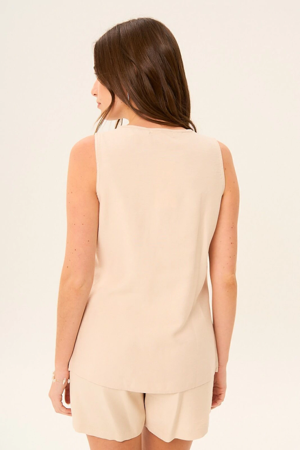 Chaleco sastrero confeccionado en Lino, Largo por la cadera. Escote en V, acceso con botones. Composición: 85% Rayón 15% poliéster. La modelo está usando talle S.