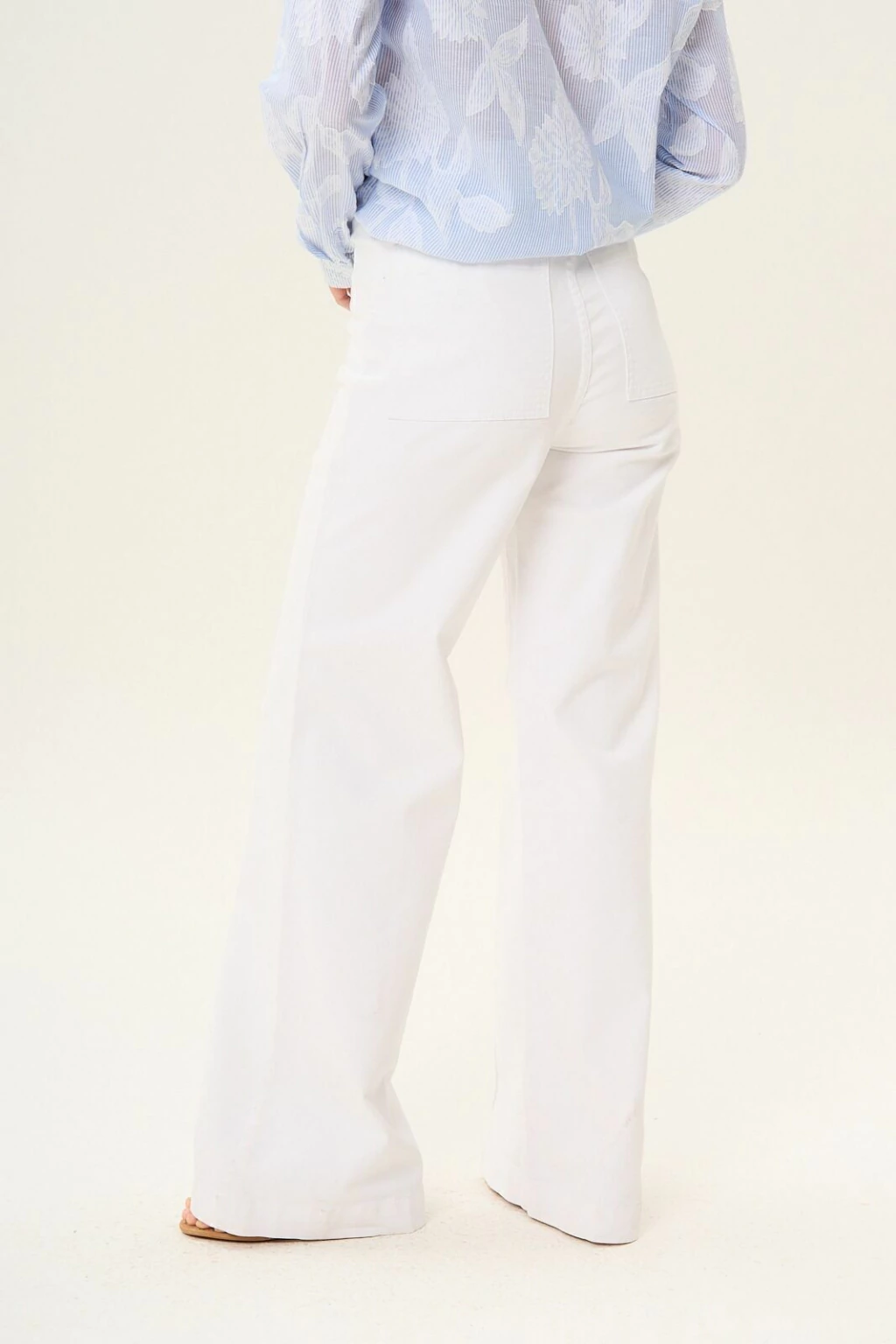 jeanblanco estilo marine, pierna ancha y recta con ruedo deshilachado, super tiro alto, con detalle de alforza en el delantero. Composición: 98% Algodón 2% ELÁSTANO. La modelo está usando talle 26.
