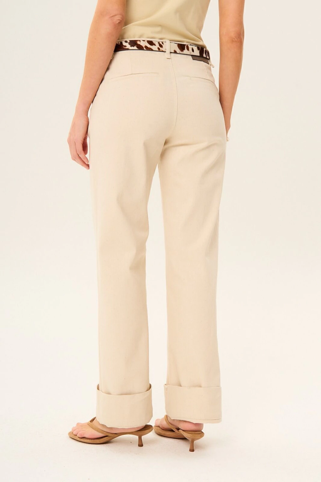 Pantalón de tiro alto con bolsillos delanteros y falsos bolsillos de vivo en espalda. Detalle de alforzas delanteras. Piernas rectas. Cierre frontal y botón. Composición: 98% Algodón 2% Elastano. La modelo está usando talle 26.