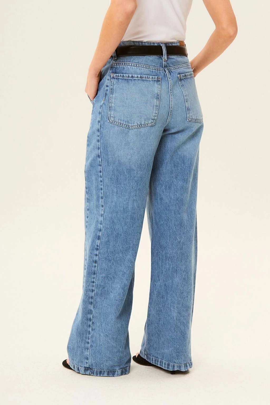 jeans wide leg tiro alto, efecto desgastado sutil. Los bolsillos delanteros evocan a los Pantalónes sastreros. Composición: 100% Algodón. La modelo está usando talle 26.