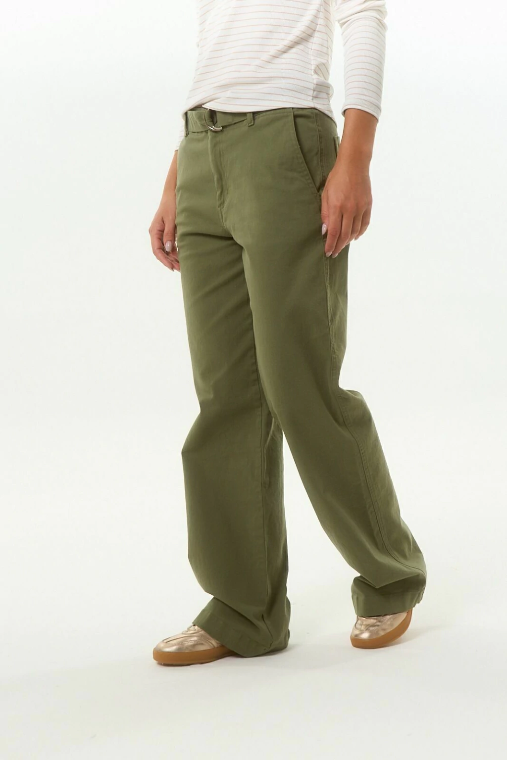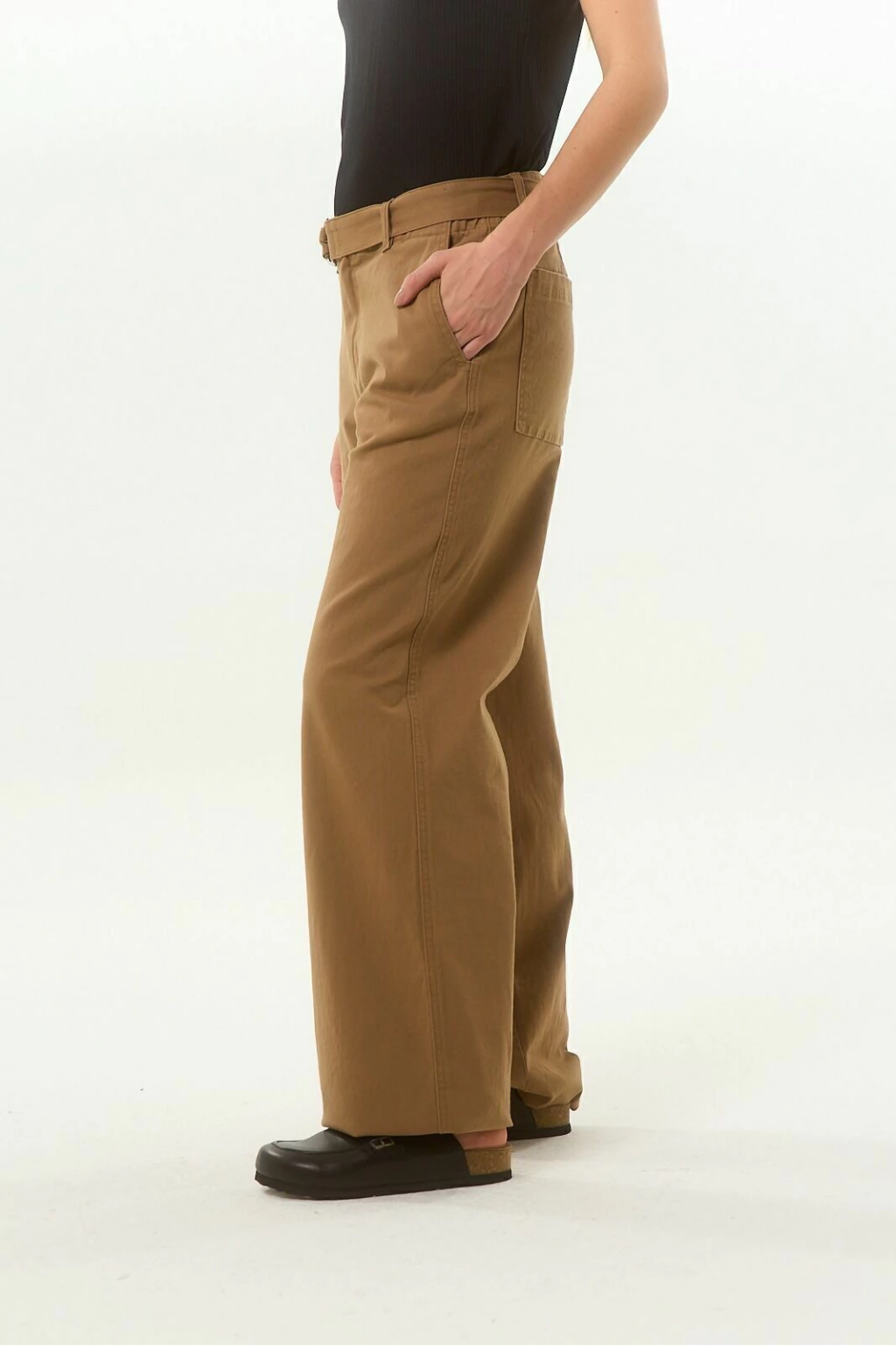 Pantalón tipo wide leg de gabardina, con cierre delentero, botón y cinto para ajustar en cintura. Bolsillos laterales delanteros y bolsillos plaque en trasero. 97% Algodón - 3% Elastano