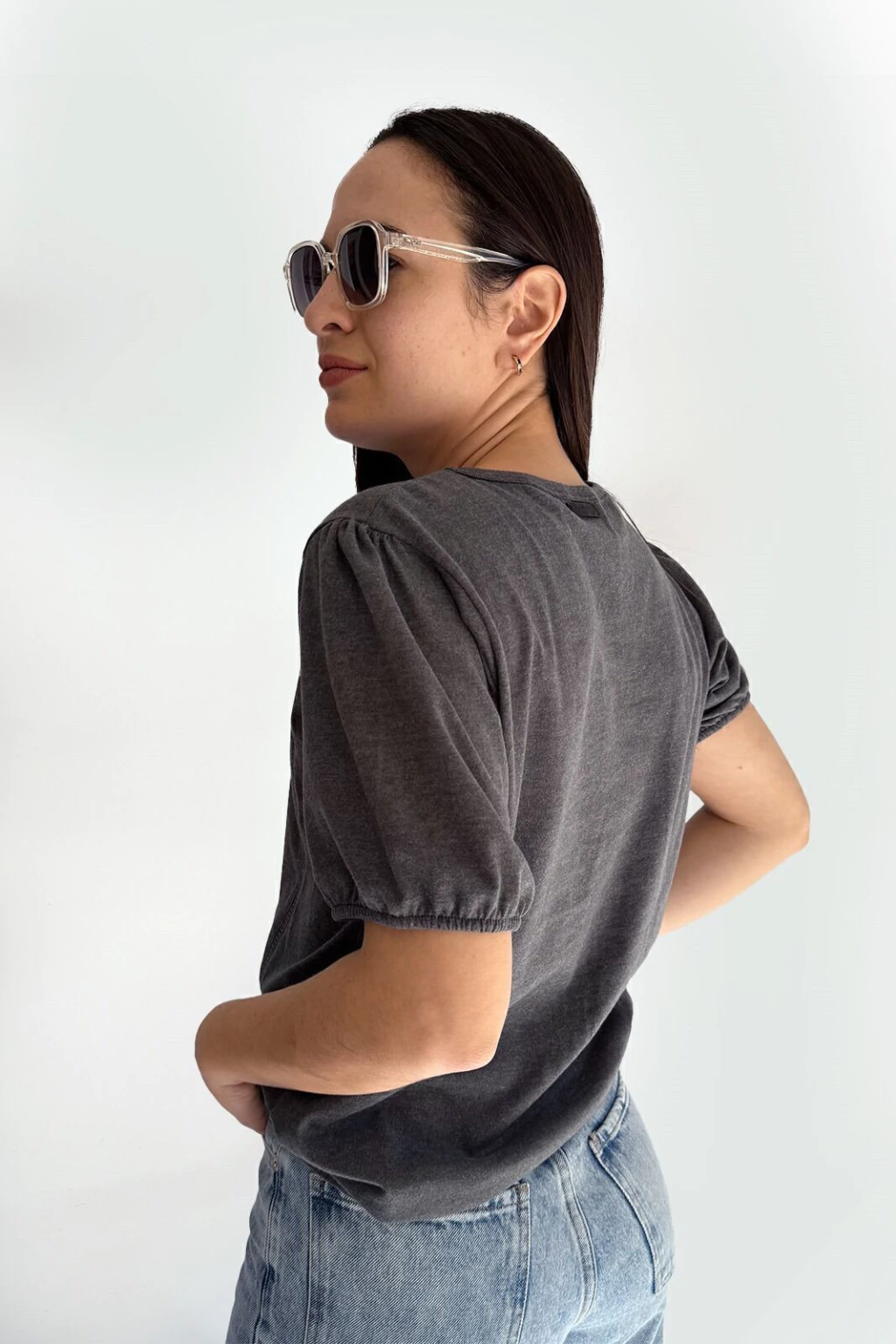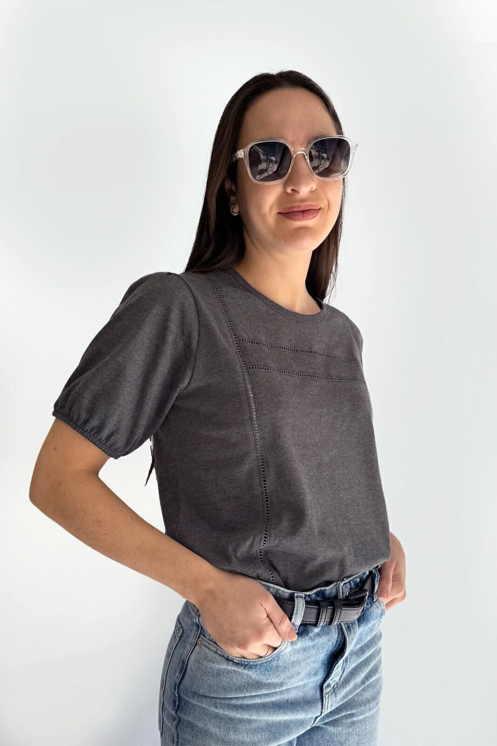 Remera de Jersey Soft con escote redondo, mangas cortas y recortes con puntilla en el delantero. Tiene mangas fruncidas y elástico. 65% Algodón - 35% poliéster