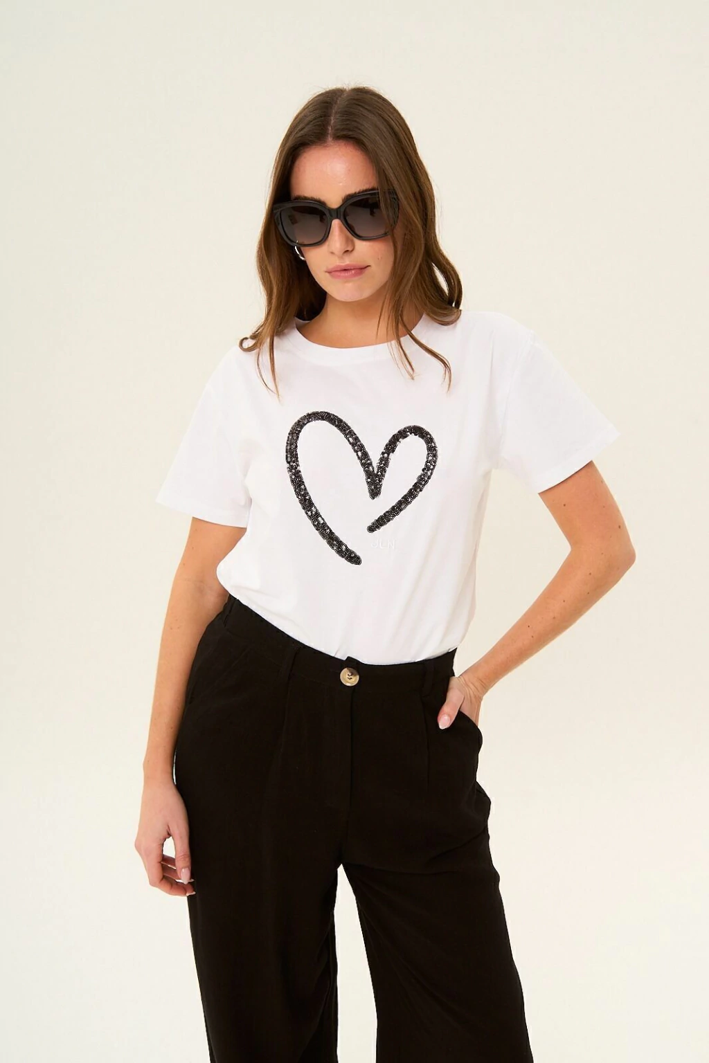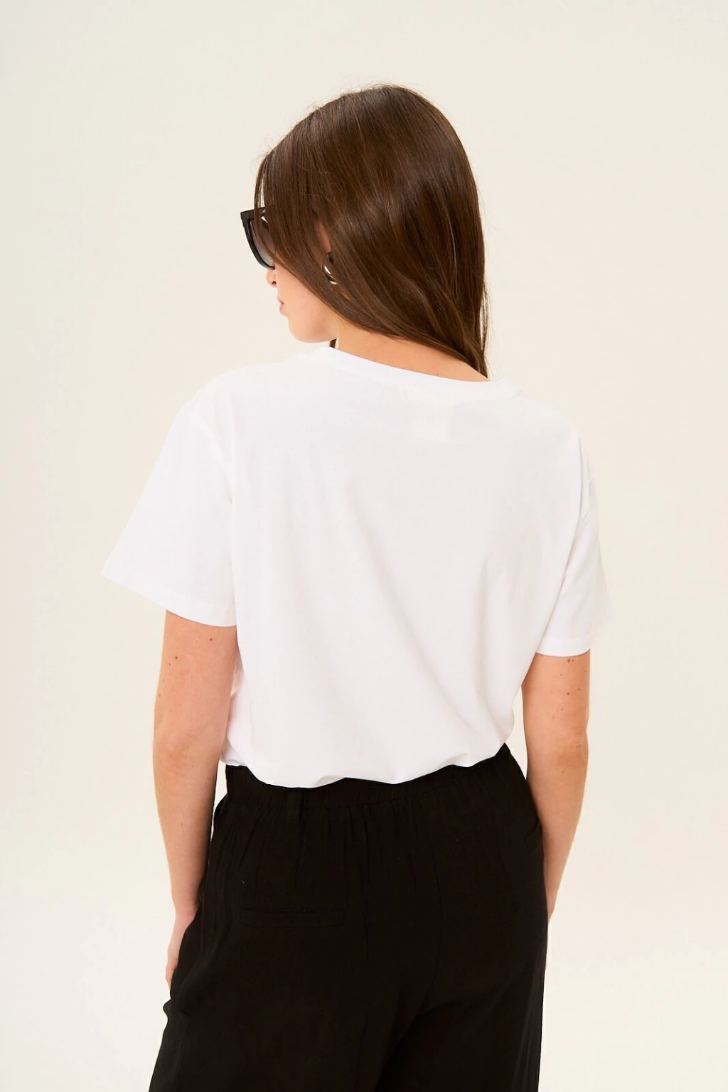 Remera de jersey con lycra, escote redondo y manga corta. Lleva estampa en el delantero. Composición: 95% Algodón - 5% Elastano. La modelo está usando talle S.