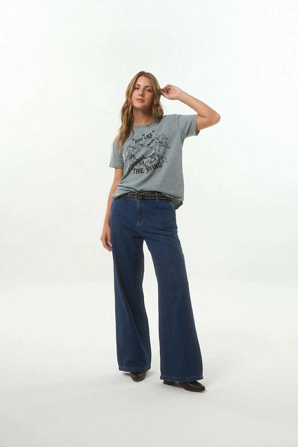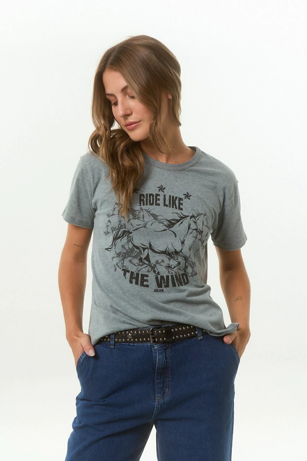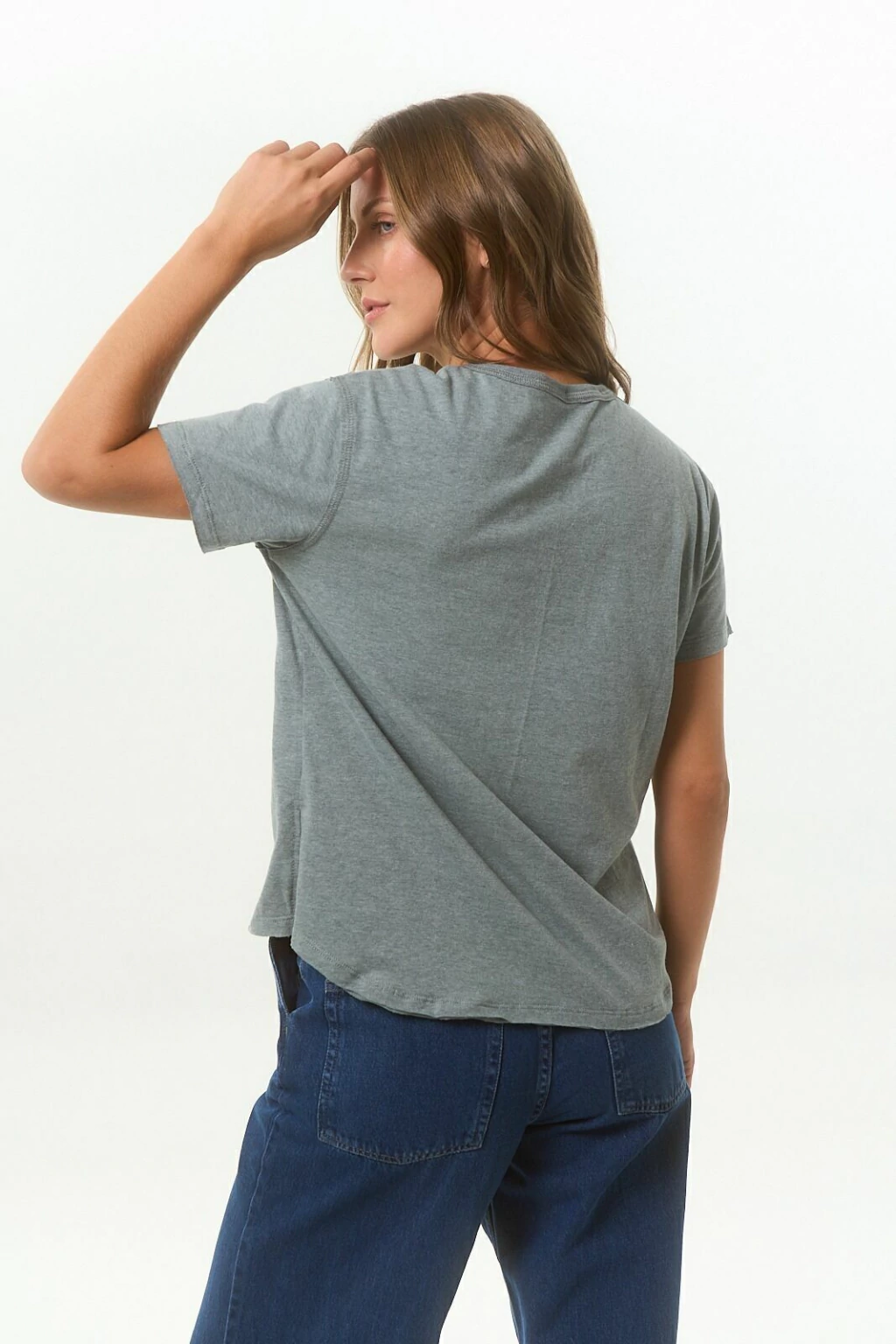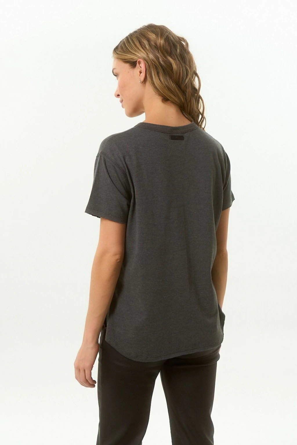 Remera básica de jersey soft, escote redondo y manga corta. Lleva estampa en el delantero y detalle de terminaciones al corte. 65% Algodón - 35% poliéster