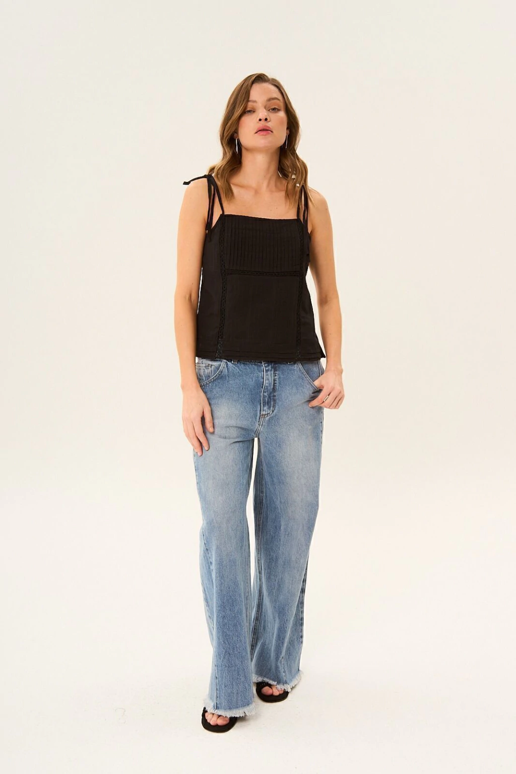 Top sin mangas, bretel fino y regulable. Escote cuadrado, detalles en frente con galon de broderie. Composición: 100% Algodón. La modelo está usando talle S.
