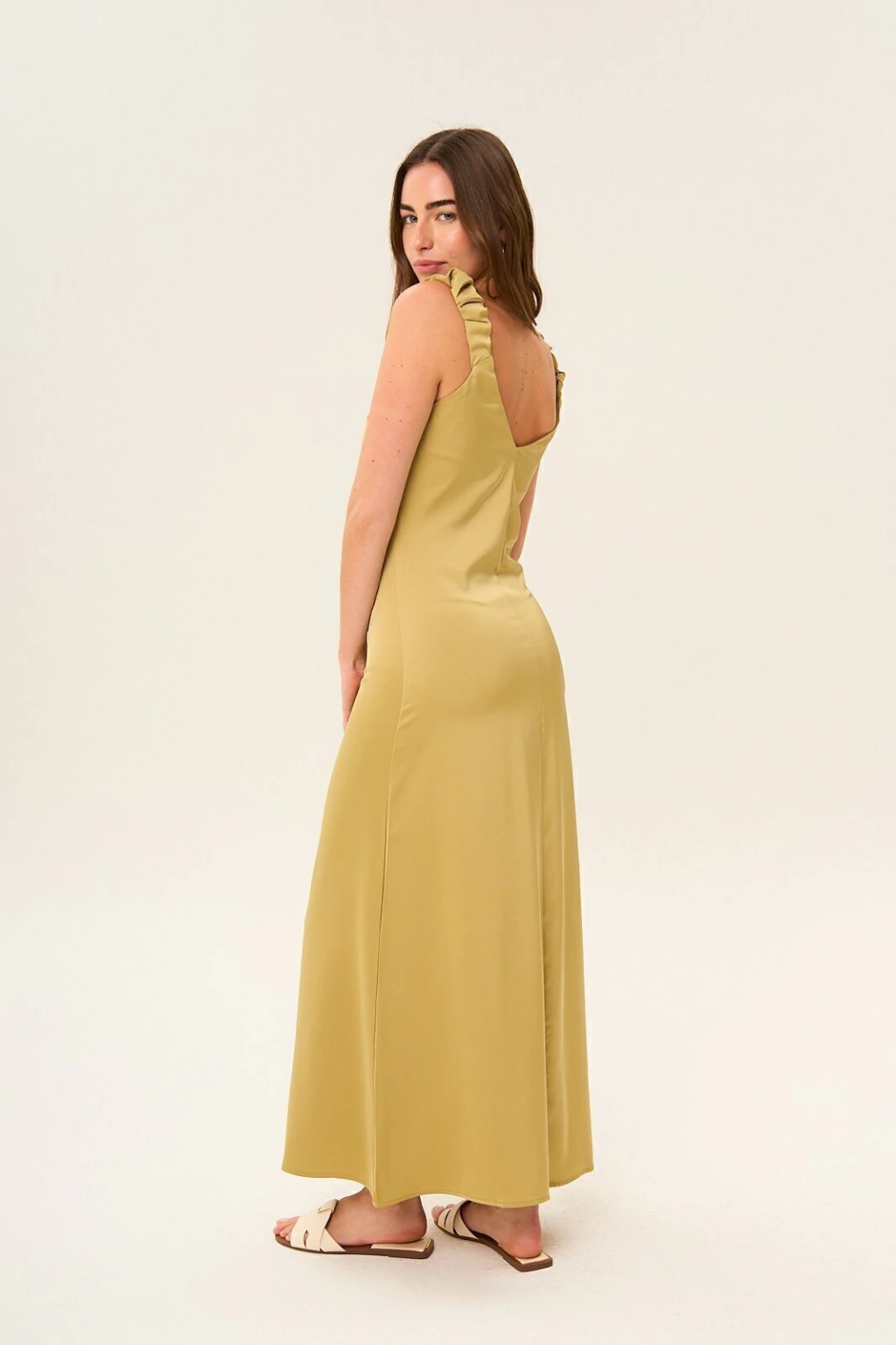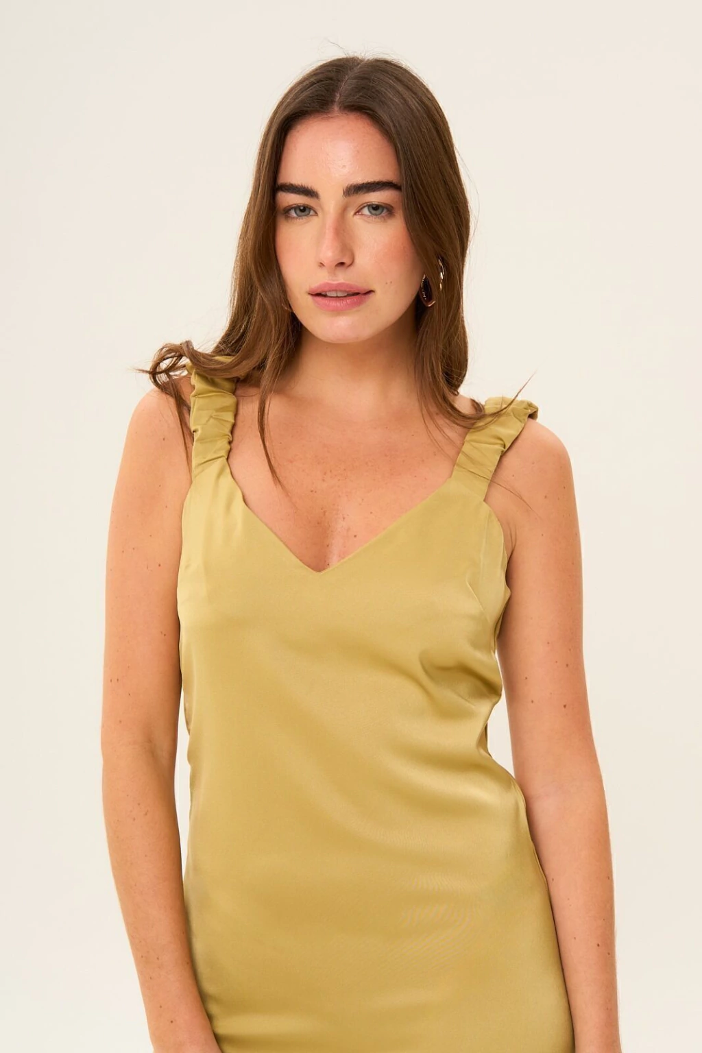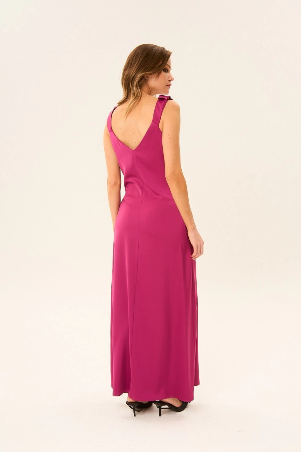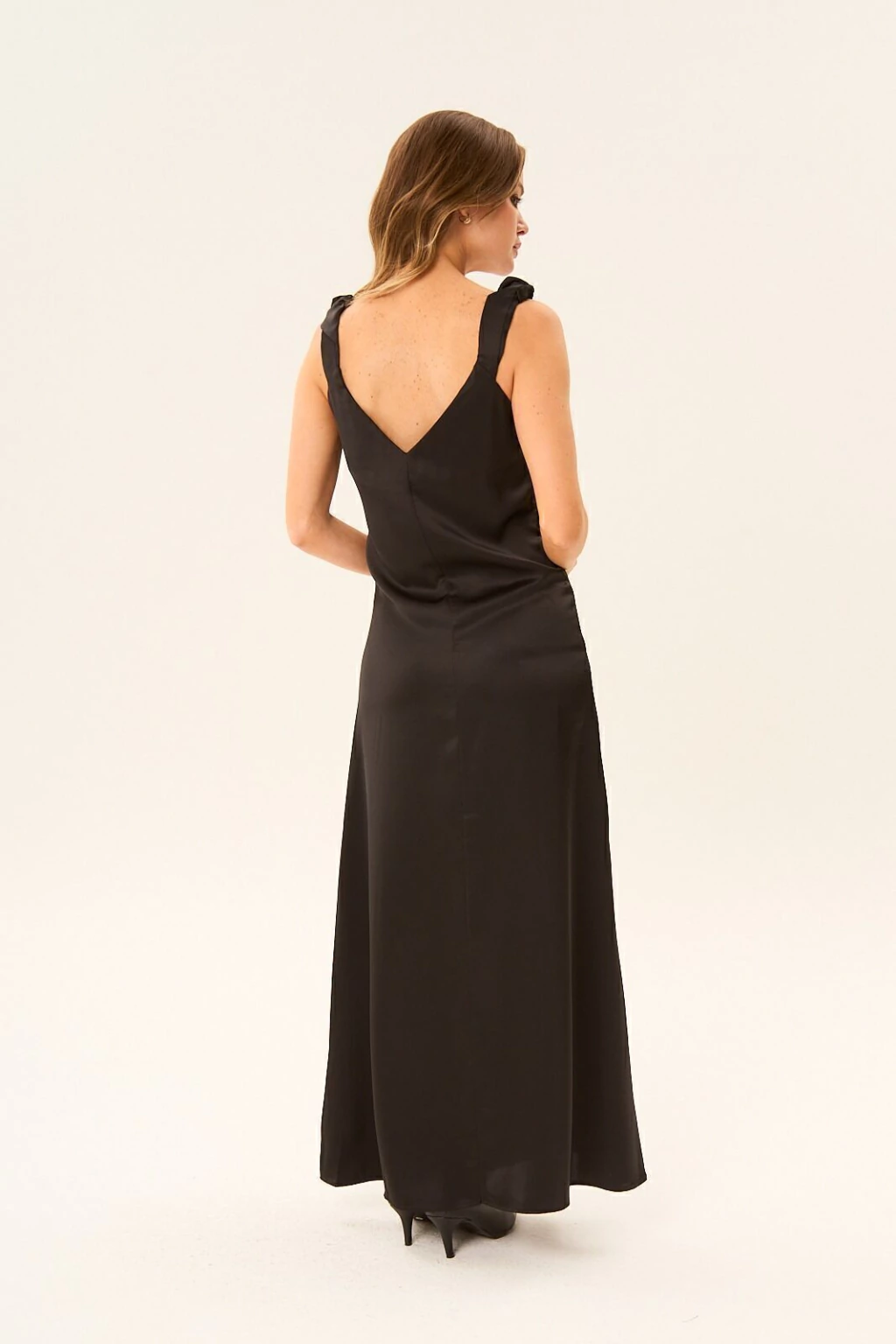 Vestido largo con bretel ancho elástico. Acceso con cierre lateral. Escote en V en frente y espalda. Composición: 90% Poliéster - 10% Elastano. La modelo está usando talle S.