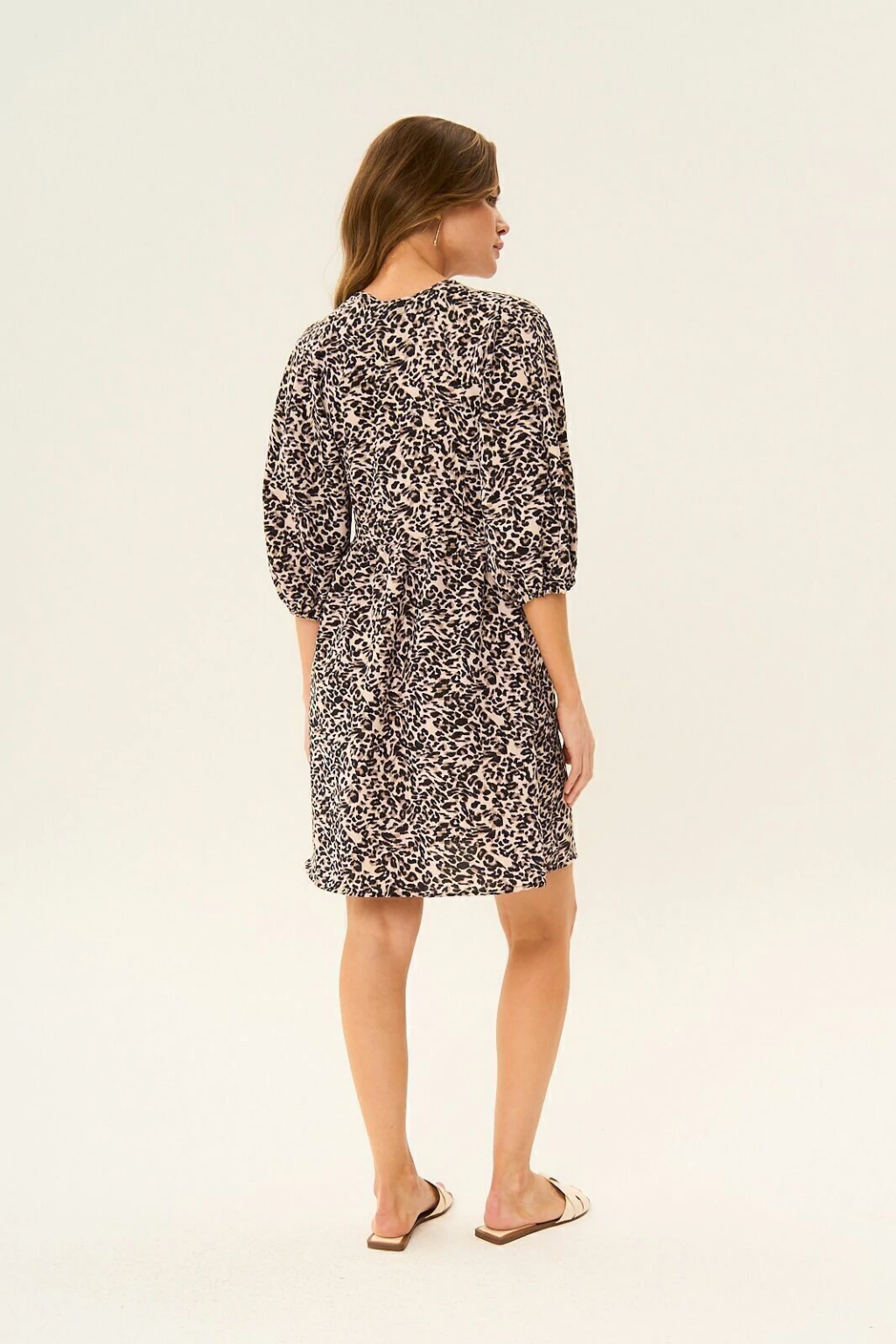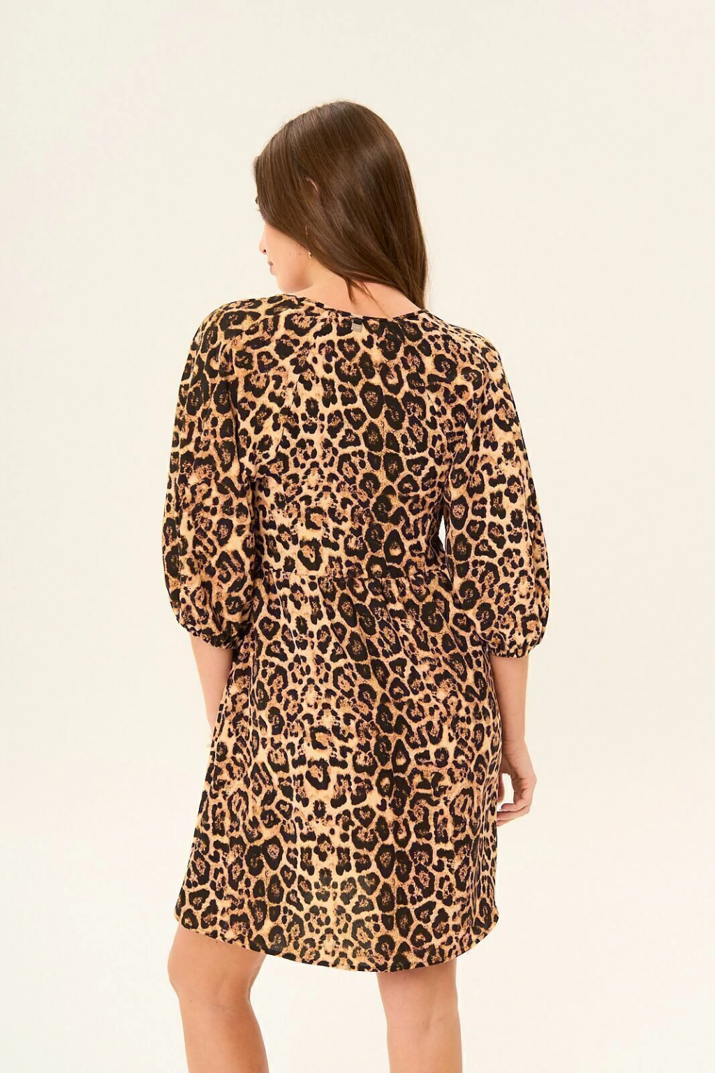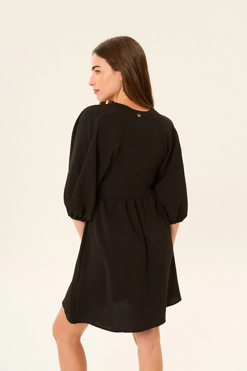 Vestido confeccionado en tela crepe. Silueta suelta, con escote en V, mangas cortas tipo globo y largo por encima de la rodilla. Composición: 100% poliéster. La modelo está usando talle S.